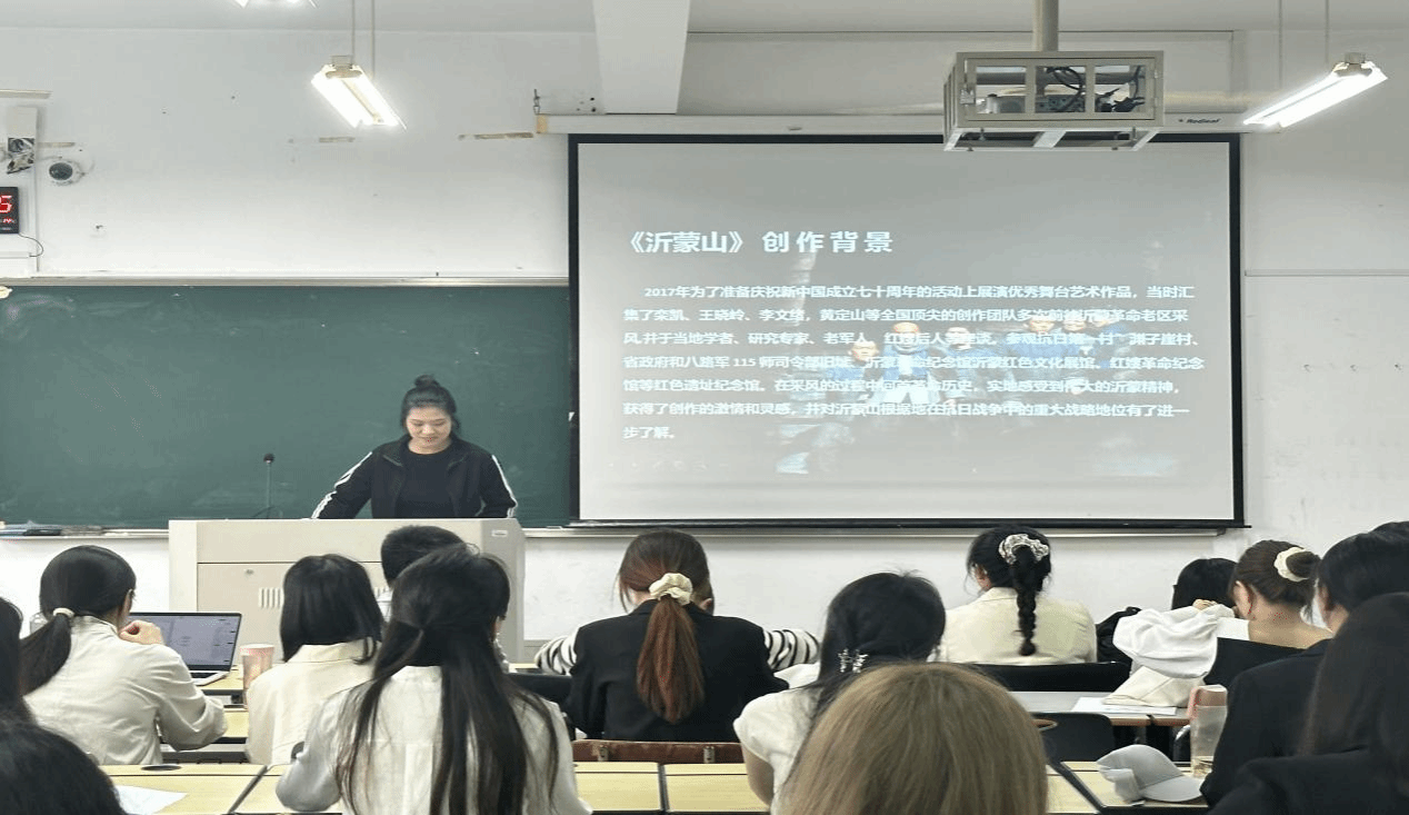 第一项议程,是由第二党小组的刘思静同志带领大家进行音乐党课的学习。她从创作背景、剧情简介、选段为大家介绍了民族歌剧《沂蒙山》,该作品以抗日战争时期革命老区沂蒙山为创作背景,以大青山突围、渊子崖保卫战为创作素材,讲述了沂蒙山抗日根据地军民同甘共苦、生死相依的动人故事,彰显了沂蒙精神的伟大内涵。